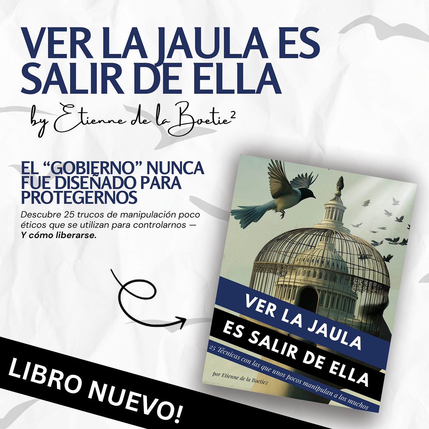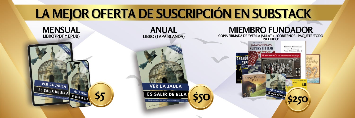 Pásate al nivel de pago de $5 al mes y te enviaremos las versiones en PDF y e-Pub de AMBAS ediciones, la de España y la de Latinoamérica, del nuevo libro de Etienne de la Boetie: Ver la jaula es salir de ella: 25 técnicas con las que unos pocos manipulan a los muchos y un código de cupón del 10% de descuento para cualquier artículo en https://artofliberty.org/store/.