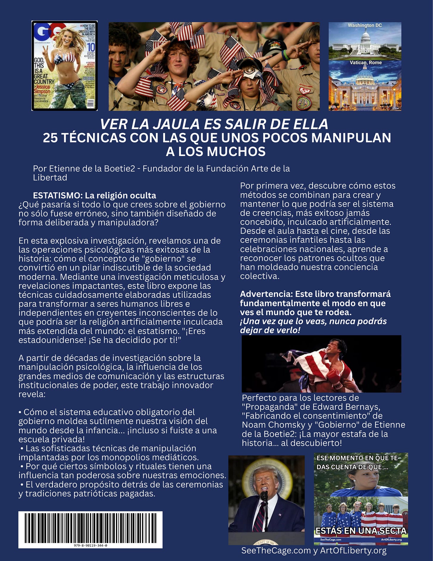 La Fundación Arte de la Libertad, una fundación de políticas públicas voluntaristas, anuncia un nuevo libro: Ver la jaula es abandonarla: 25 técnicas con las que unos pocos manipulan a los muchos. El libro más reciente del fundador de la fundación, Etienne de la Boetie2, expone que el gobierno y Hollywood han estado ejecutando una operación psicológica multimillonaria y multigeneracional sobre la población para adoctrinarla y que acepte a una clase dominante, impuestos confiscatorios y una moneda de reserva fraccionaria inflacionaria emitida por bancos privados.