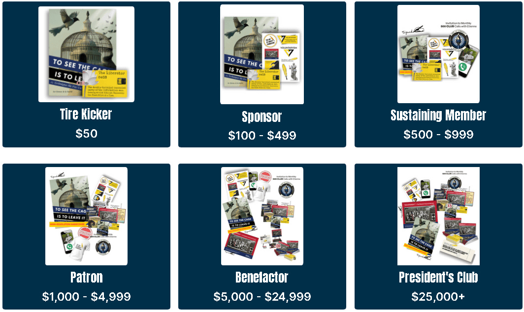 El programa de patrocinio de la fundación se encuentra en ArtOfLiberty.org/Sponsor. Los voluntaristas, libertarios y simpatizantes del movimiento por la libertad y la verdad que se conviertan en patrocinadores anuales de Art of Liberty obtienen beneficios que pueden incluir una copia física (paperback) de Ver la jaula es salir de ella: 25 técnicas con las que unos pocos manipulan a los muchos, ya sea en inglés o en español.